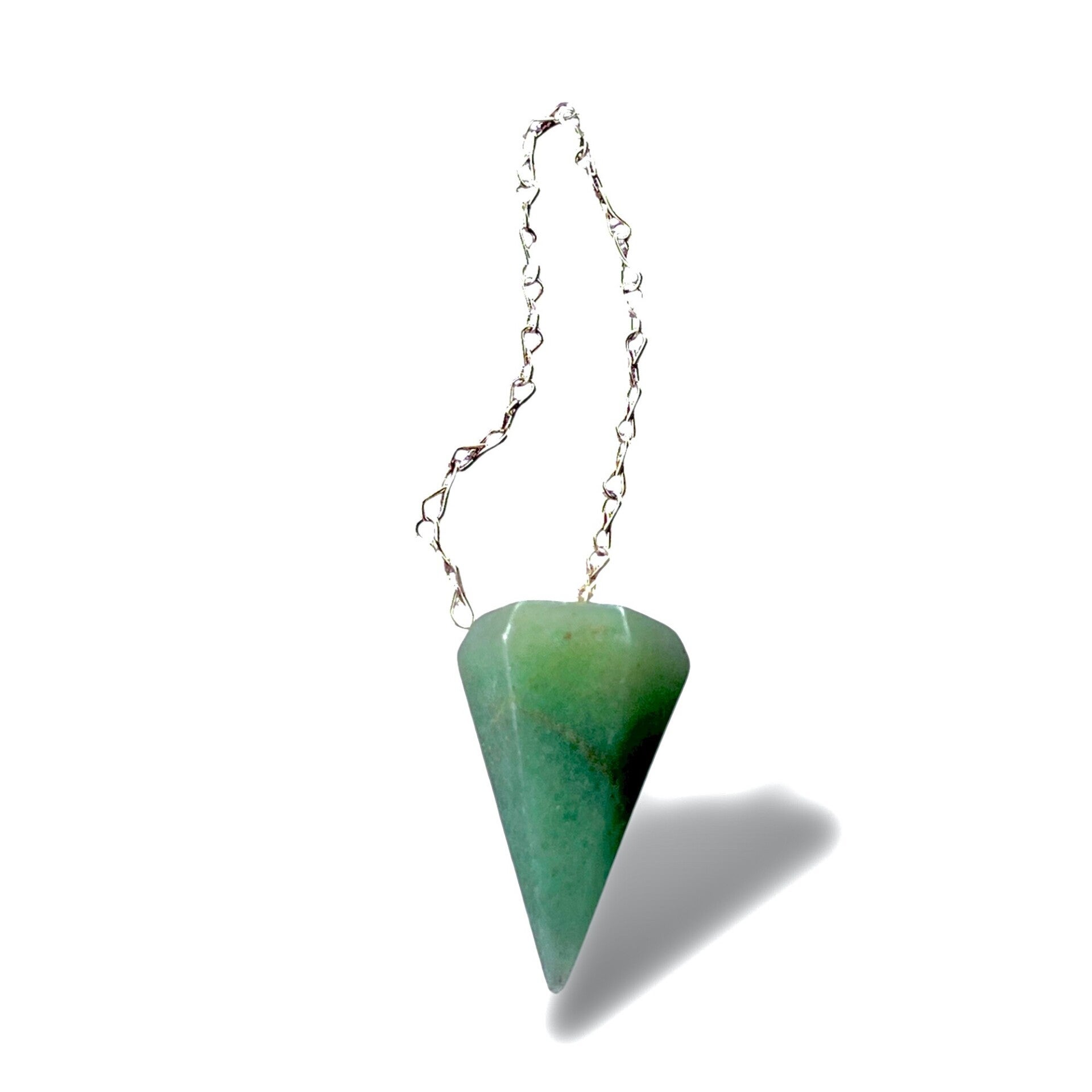 Ein blattgrüner Aventurin mit kleineren, magischen Einschlüssen, verarbeitet zu kegelförmigen sechs-eckigen Pendel.