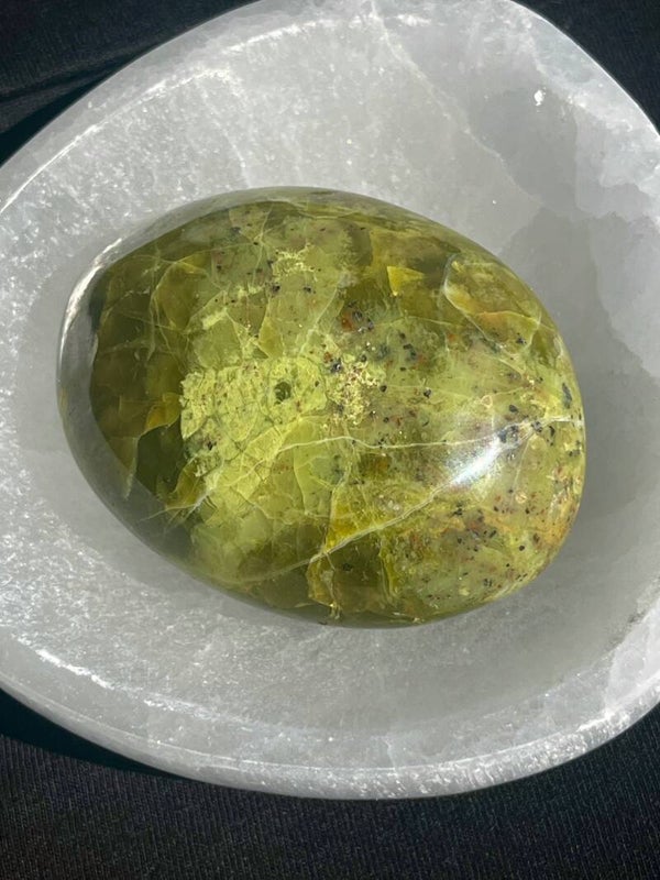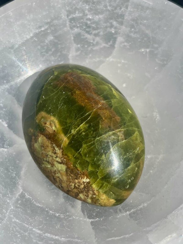 Lege deinen grünen Opal über Nacht in eine Selenit-Schale oder auf eine Selenit-Platte, um ihn sanft von Energien zu reinigen und wieder aufzuladen. So bleibt seine Kraft klar und unterstützend für deinen Alltag.
