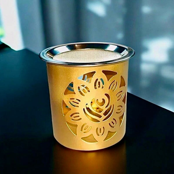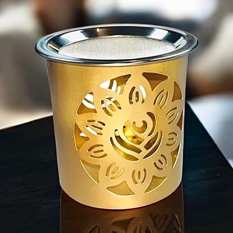 Räucherstövchen mit Sieb – Sanftes Räuchern von Räucherwerk, Weihrauch & Harz | Eisen & Gold, 8 cm I Goldene Sonne
