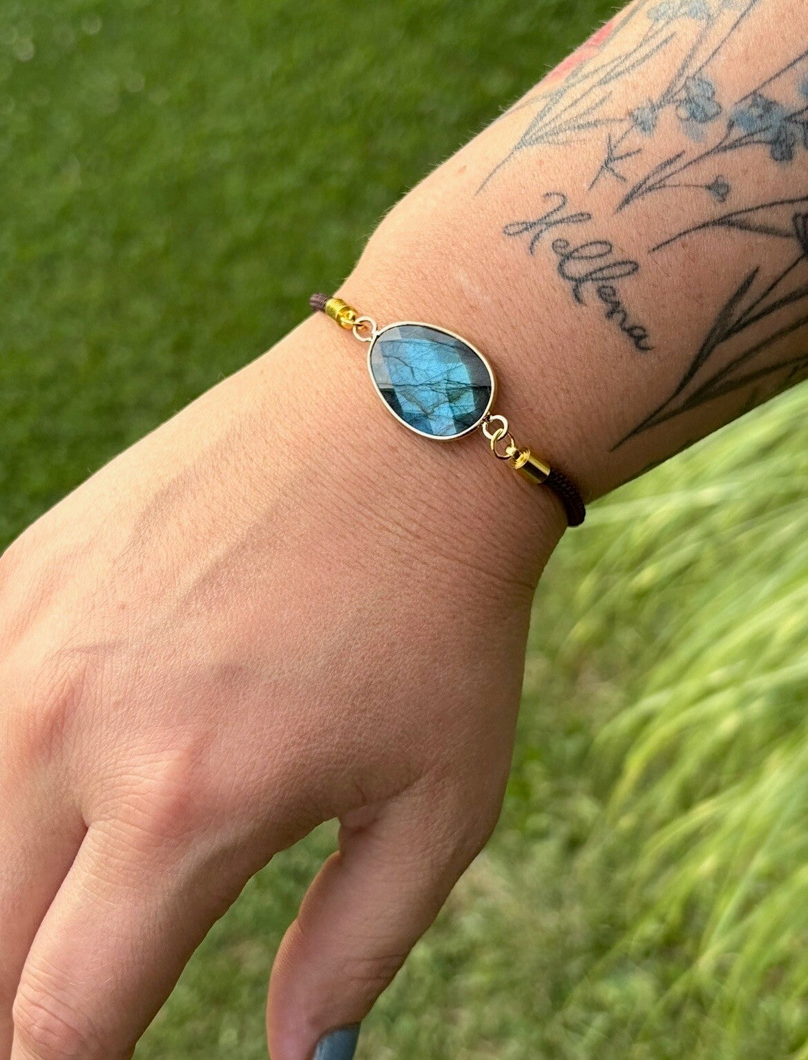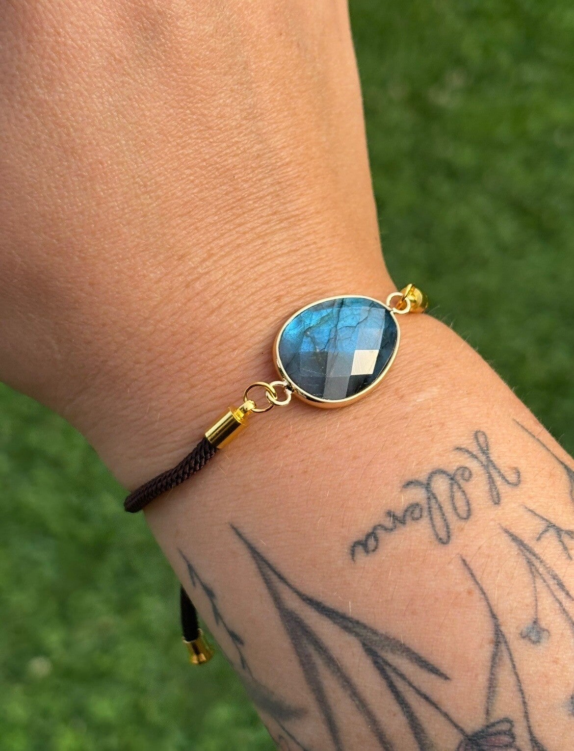 Dieses edle Kordelarmband mit facettiertem Labradorit ist ein wahres Schmuckstück für alle, die sich mit ihrer inneren Wahrheit verbinden wollen.