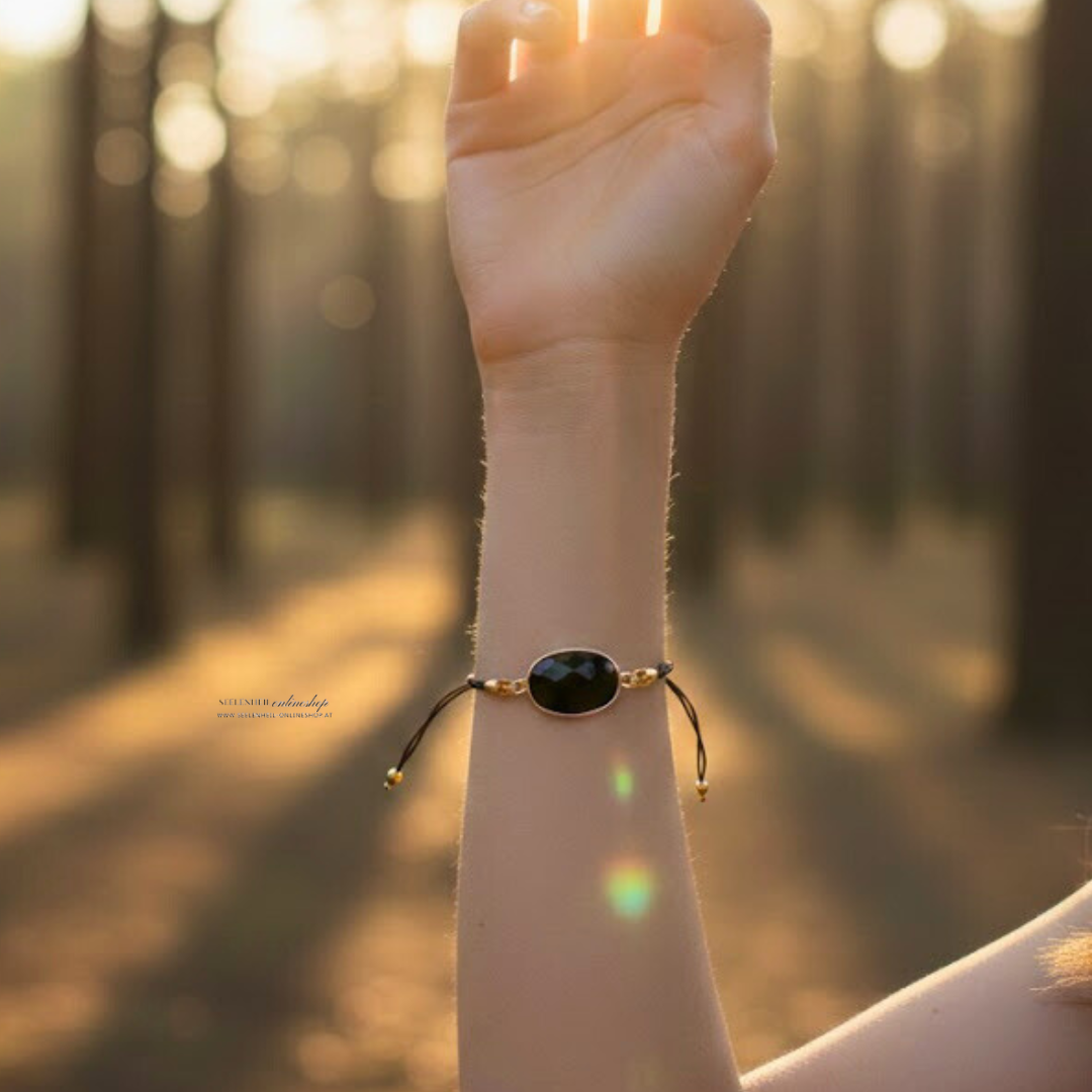 Dieses edle, größenverstellbare Kordelarmband mit einem facettierten Obsidian-Edelstein (ca. 2 cm) wurde mit viel Liebe zum Detail gefertigt.
