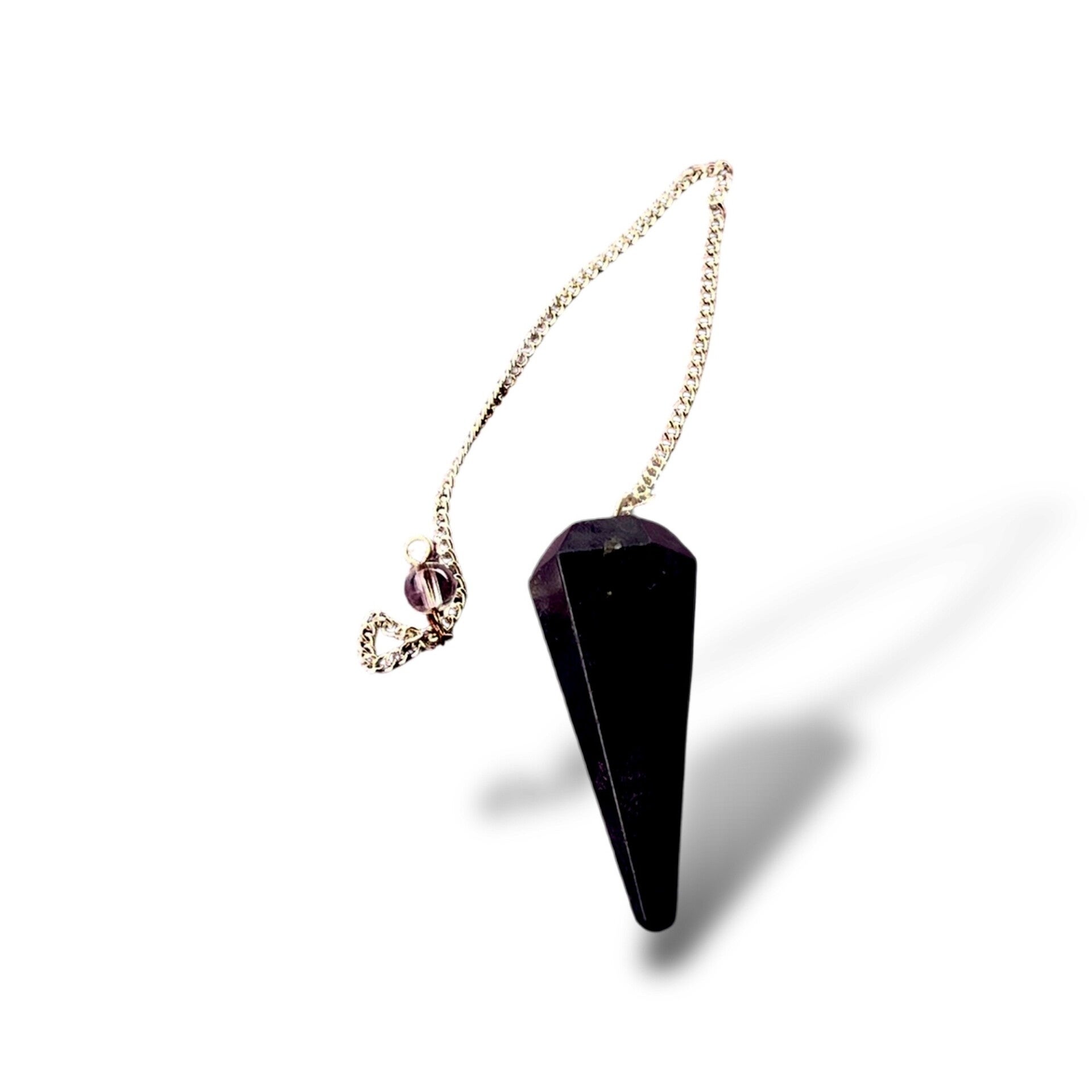 Ein schwarzer Turmalin Edelstein, verarbeitet zu kegelförmigen sechs-eckigen Pendel.