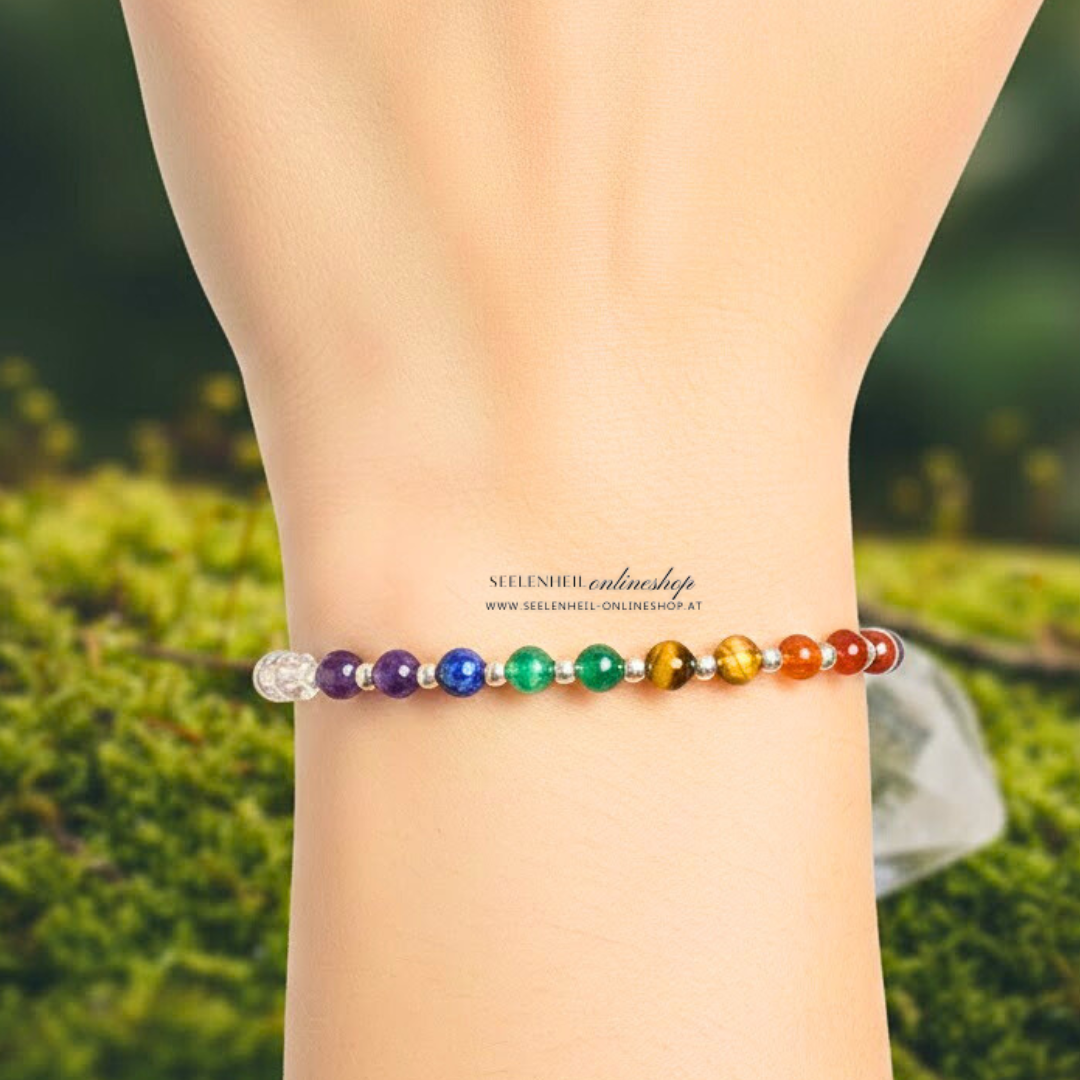 Dieses stilvolle Chakra Armband vereint sieben sorgfältig ausgewählte Heilsteine, die deine Chakren energetisch unterstützen und dein Wohlbefinden auf ganzheitlicher Ebene stärken. Die hochwertigen Edelsteinperlen sind auf einem robusten Band aufgereiht – zwischen jeder Perle befindet sich ein feines, versilbertes Metallelement, das dem Armband Eleganz und Struktur verleiht.